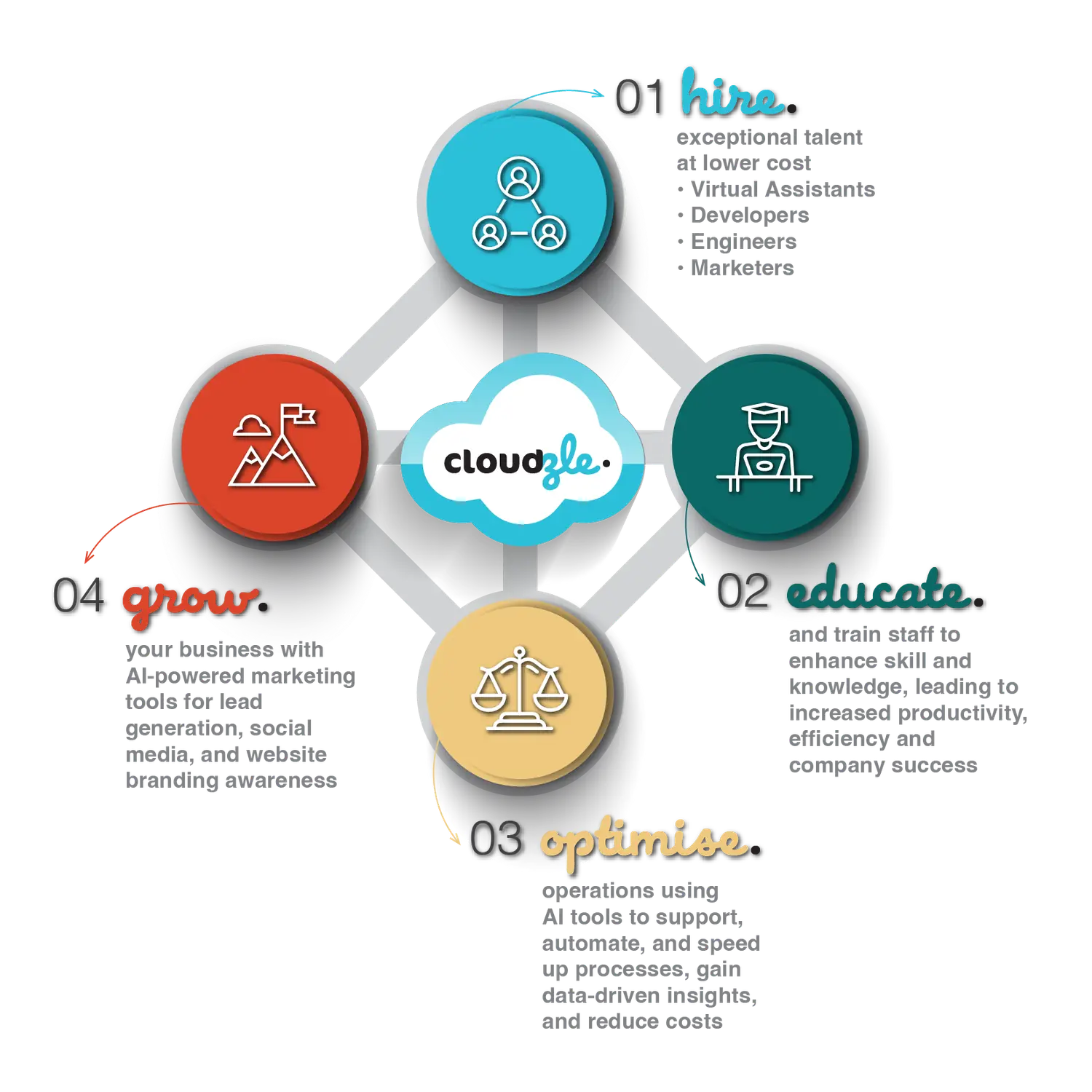 At Cloudzle, we are dedicated to empowering businesses to operate more cost-efficiently and optimally across all aspects of your operations. We help you find low-cost talent, educate your employees, optimise processes through AI technology, and drive avenues for growth through social media for branding awareness, help customers find you, and generate new opportunities. At Cloudzle, we're not just a service provider; we're your partner in driving efficiency, innovation, and success in today's competitive business environment.
